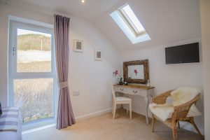 Bedroom Three & Ensuite – Can be set up as a Superking or twin room. This bedroom has the most space so ideal for parents needing a cot bed set up (cot available). This bedroom overlooks fields and woodland. There is a TV with built in DVD player. The en-suite has a toilet, sink and beautifully tiled walk in shower.